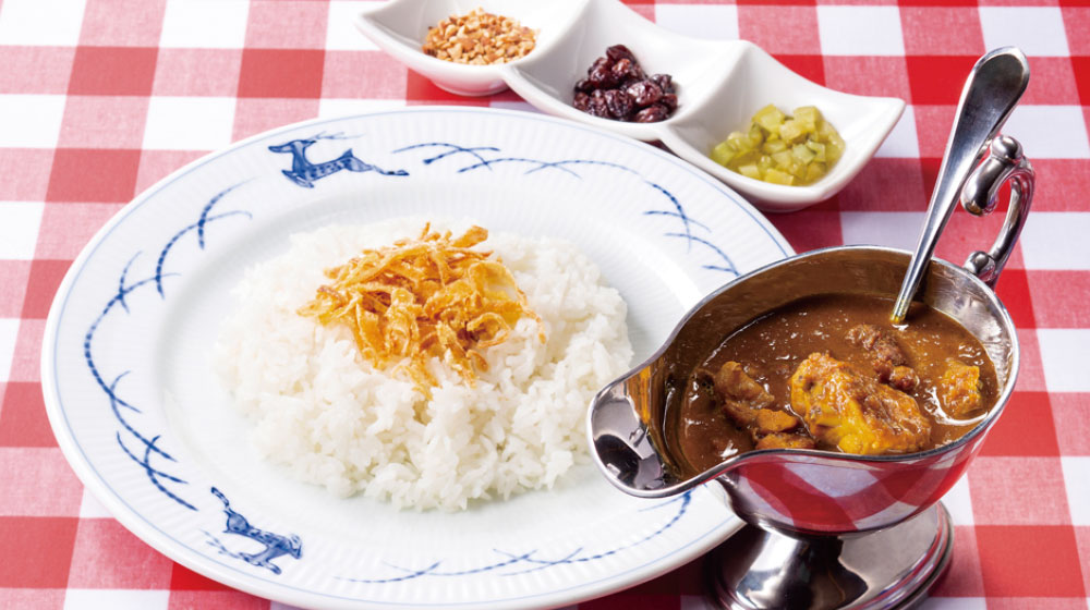 1925年創業の三笠會館伝統の洋食メニューを落ち着いた空間で。三笠會館が外食メニューとして初めてお出しした骨付き鶏の唐揚げをはじめ、手間暇かけたデミグラスソースのハンバーグ、かつて西洋釜飯と銘打っていたドリア他、カフェメニューも充実。伝統の味を気軽にテイクアウト出来るデリも併設し、地域の皆さまにデイリーにお使いいただけるお店です。ご提供のカレーは伝統メニュー「インド風チキンカレー」。ドライカレーにもこちらを使用。仕込みから仕上げまで丸3日間を要するこのカレーは、骨付き鶏肉の旨みとスパイスの爽やかな辛みが絶妙に溶け合う味わい。ルウを使わず野菜や果物の自然なとろみで仕上げたさらりとした口当たり。名物の唐揚げ用の肉はかつて鶏一羽丸ごと仕入れていた名残りから、手羽と砂肝が具になっています。一度食べたら忘れられない味をぜひ体験してみてください。